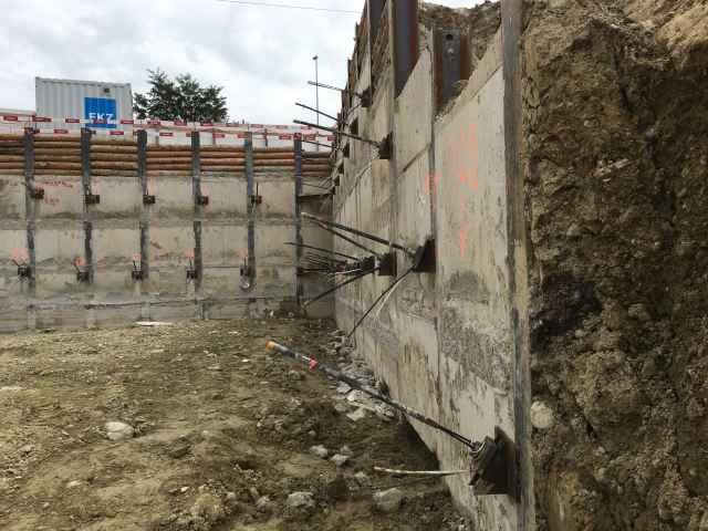 Der Baugrubenverbau besteht aus einer rückverankerten Rühlwand. Die Rückverankerung besteht aus temporären ausbaubaren Litzenankern vom Typ Stahlton Terra. Die Anordnung der Anker erfolgte in 2 Ankerlagen.